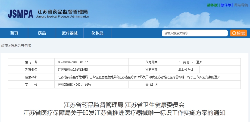 7月26日消息,江蘇省藥監(jiān)局聯(lián)合省衛(wèi)健委、省醫(yī)保局印發(fā)《江蘇省推進(jìn)醫(yī)療器械唯一標(biāo)識(shí)工作實(shí)施方案》。